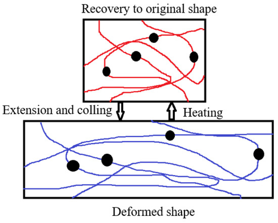 Therefore, SMPs/SMPCs utilise a dual behaviour. The first is high elastic behaviour related to chemical crosslinking, molecular entanglement or the crystalline phase. The second behaviour is reversible in that the temporary shape can return to the original shape with a stimulus such as heating (Figure 13). This phenomenon is related to the glass transition temperature (Ttrans or Tg) and reversible molecular crosslinking structure. The shape recovery occurs by releasing the stored strain energy in the temporary shape. Therefore, the fixed and reversible process represents the shape memory behaviour of the SMPs/SMPCs [43,109,110].