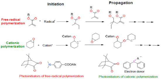 Photoinitiator molecules generate reactive species to link between the light source and the resin mixture to initiate photopolymerisation. Photoinitiators are in the form of solid or liquid that should be dissolved in the mixture resin. Generally, there are two types of reactions in photopolymerisation processes, radical and cationic (Figure 14) [113]. Initiation occurs under light irradiation, in which a photoinitiator or photoinitiator system is responsible for converting photolytic energy into the reactive species [114,115,116]. The photoinitiating systems for 3DP applications are discussed here, while the mechanisms of the photoinitiation reactions are comprehensively discussed in reviews [39,117,118]. Table 1 presents a list of radical and cationic photopolymerisation systems and their advantages for additive manufacturing.