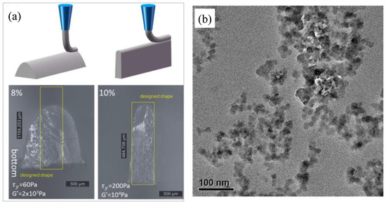 For instance, researchers have already demonstrated the effective use of liquid-based resins consisting of photoreactive liquid and fillers, such as silver nanoparticles, copper powder, halloysite nanoclay, montmorillonite and fibres, employing these materials for SLA 3D printing [47,48]. Furthermore, SLA has facilitated the advancement of 3D-printable stimuli-responsive materials, often utilising epoxy- and acrylate-based liquid resins [49,50,51,52] that contain fillers, such as preformed polymeric particles [50] or magnetic iron oxide nanopowder [53]. Variations of SLA, such as mask image projection-based stereolithography (MIP-SL), projection micro-stereolithography (PµSL) and two-photon polymerisation-based printing (2PP), have also been employed within this context [54,55,56].