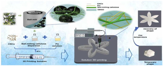 - Zhou, Y.; Wang, F.; Yang, Z.; Hu, X.; Pan, Y.; Lu, Y.; Jiang, M. 3D Printing of Polyurethane/Nanocellulose Shape Memory Composites with Tunable Glass Transition Temperature. Ind. Crops Prod. 2022, 182, 114831. [Google Scholar] [CrossRef]