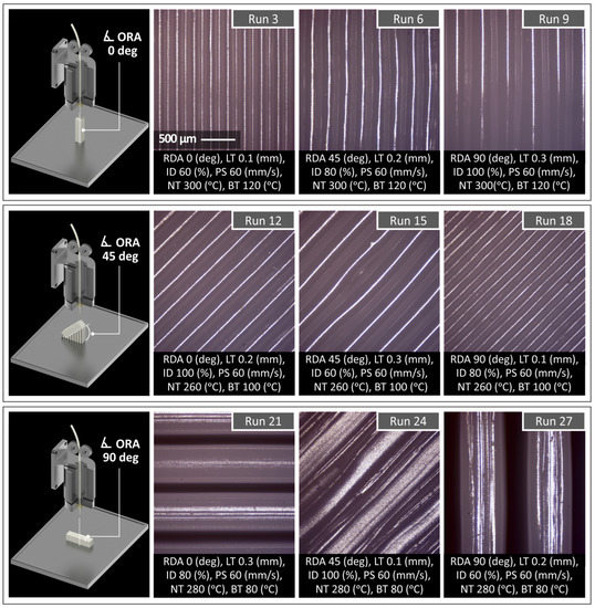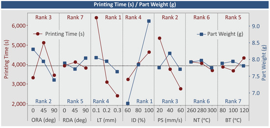 - For the printing time (s), LT (mm) is the most critical parameter (rank No. 1), and then PS (mm/s). The increase in both leads to a decrease in the printing time (s). The increase in ID increases the printing time (s). The median value of 45 deg for the ORA increases the printing time (s), while low and high values lead to reduced printing time (s) values. The remaining control parameters (BT, NT, and RDA) do not significantly affect the printing time (s) response parameter, with RDA being the least important control parameter.