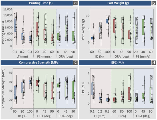 - For the printing time (s), only an LT of 0.3 mm shows a compact response. All the other parameters and levels show a scatter response, indicating a strong influence on the printing time (s) response parameter.