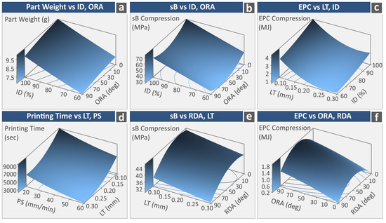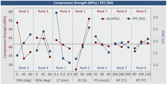 - For the compressive strength (MPa), ID (%) is the most critical parameter (rank No. 1), and then ORA (deg). The increase in ID leads to an increase in compressive strength (MPa). Higher compressive strength (MPa) strength values are achieved with low ORA and RDA values. The increase in LT (mm) decreases compressive strength (MPa). The remaining control parameters (PS, NT, and BT) do not significantly affect the compressive strength (MPa) response parameter, with PS being the least important control parameter.