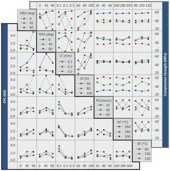 - For the compressive strength (MPa), an ID of 60% and 100%, ORA 0 deg, and RDA 0 deg show a compact response. All the other parameters and levels show a scatter response, indicating a strong influence on the compressive strength (MPa) response parameter.