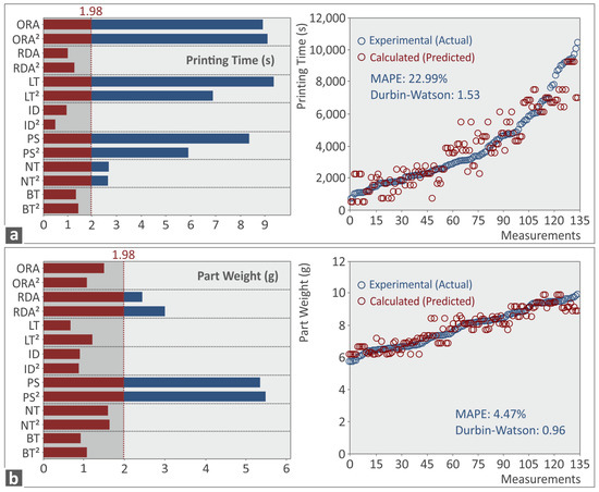 - Figure 11a (printing time—s): the statistically important parameters are ORA, ORA2, LT, LT2, PS, PS2, NT, and NT2. The MAPE is 22.99%, which is an acceptable result. The Durbin–Watson factor is 1.53, showing a positive autocorrelation of the prediction residuals.