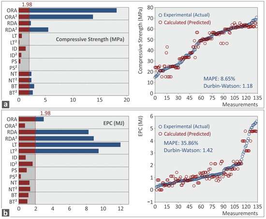 - Figure 12a (compressive strength—MPa): the statistically important parameters are ORA, ORA2, RDA2, NT, NT2, BT, and BT2. The MAPE is 8.65%, which is a very acceptable result, verifying the reliability of the model. The Durbin–Watson factor is 1.18, showing a positive autocorrelation of the prediction residuals.