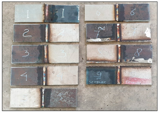 Figure 1 shows the weld joint of SS316 and ASTM A36 with nine welding parameters referred to as the L9 orthogonal array. All the weld joints have been approved by radiographic examination, proving the soundness of the weld.