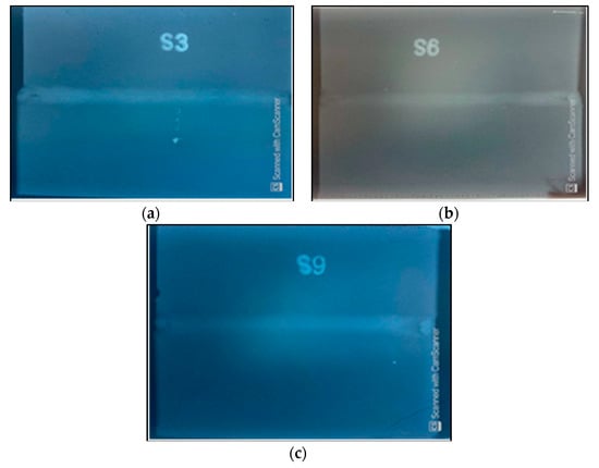 X-ray radiographic results of (a) experiment No. 3, (b) experiment No. 6 and (c) experiment No. 9.