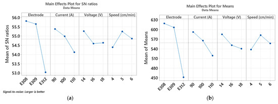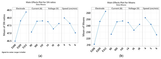 The study of four parameters (electrode type, welding current, arc voltage, and welding speed) concerning the flexural strength, in terms of the main effects plot for means and main effects plot for S/N rations for each interaction, is elucidated in Figure 6.