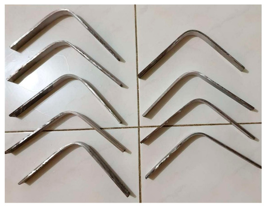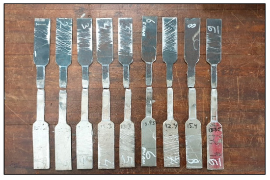Typical samples of flexural testing are presented in Figure 7. The flexural strength increased with the increasing welding current and arc voltage. Furthermore, the highest flexural strength was obtained at electrode type E312 and a welding speed of 5 cm/min. The larger-the-better flexural strength concerning the electrode type, welding current, arc voltage, and welding speed demonstrated the optimal input factor values (A1, B1, C1, and D2).