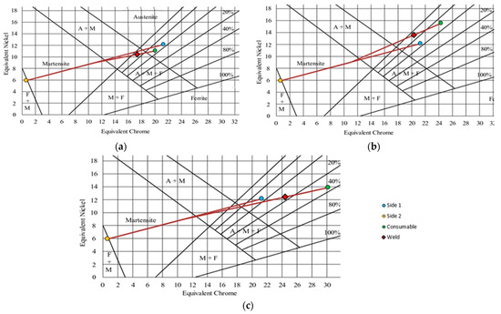 The microstructure of dissimilar welding can be predicted by constitution diagrams, e.g., the Schaeffler diagram. It estimates weldability and phase formation in the fusion zone using different electrodes [32]. Schaeffler diagrams can predict the proportions of martensite, austenite, and ferrite, as shown in Figure 8.