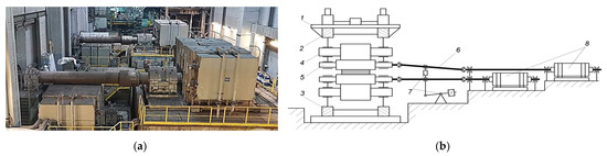 Figure 1 shows the motors and spindles of the individual drives of two stands of the hot rolling mill. Figure 1b shows a simplified kinematic diagram for the electromechanical systems of the plate mill stand’s top and bottom rolls. Reference [25] uses a similar diagram to describe the composition of the mill 5000 reversing stand equipment and provides the spindle photo.
