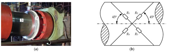 Figure 2a shows torque sensor 1 installed on a telemetry ring 2 fixed on the rolling stand’s top roll spindle 3 [50]. A similar sensor is installed on the bottom roll spindle. Figure 2b shows the layout of the strain gauges [51]. At 45° to the output shaft axis, four strain gauges are attached, forming a bridge measuring circuit. The bridge output signals are transmitted to the built-in data acquisition module via an online torque telemetry, and then, after processing, to a remote data server via a USB interface. Controlled torque signals are for information only and do not participate in the drive control algorithms.