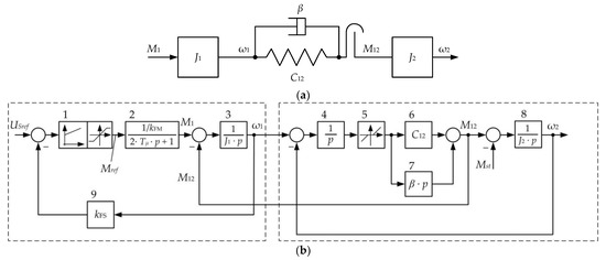 Blocks 3, 5–7 are the typical blocks of a two-mass system model [72]. They determine the nature of transient processes in the mechanical part, including the natural vibration damping (block 7). Block 5 provides gap modelling in gears. The speed feedback is modelled by block 9 with the coefficient kFS. The torque closed control loop is provided by the member 2.