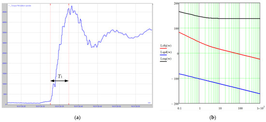 where  W r e g  is the autotuning controller’s transfer function (the method of the controller’s synthesis is considered in cl. 3.3). By integration (dividing by p), it generates the calculated torque,  M 12 C a l c , where the minuend  1 J 1 p M 1 a c t M 12 C a l c  is equal to the subtrahend  ω 1 a c t . In this case, the calculated torque,  M 12 C a l c , will be equal to the actual elastic torque,  M 1 a c t , at each time instant. This will provide the accuracy of the torque recovery. The value  1 J 1 p M 1 a c t M 12 C a l c  is the calculated 1st mass velocity. The  M 1 a c t    values are read from the PDA system with a time interval of 1 ms. Since the signal  ω 1 a c t  enters the structure in Figure 6b after the integrator  1 J 1 p , an autotuning PI controller is used. The controller parameters should be chosen to ensure astatic control over the output signal; this is the torque  M 12 C a l c .