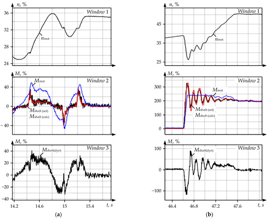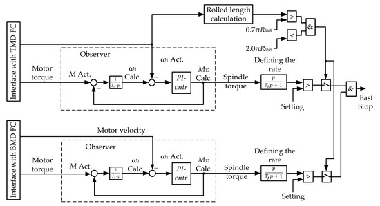 The observer-based monitoring systems are designed to control the equipment state, prevent accidents, or reveal their causes if an accident occurs. Forecasting the service life of the rolling stand main lines may be an additional problem [44,45,46]. Solving these problems requires, first of all, monitoring the spindle torque directly in the transient process. This will provide control over the signal amplitude and decay time. Thereat, it should be taken into account that indirectly measuring the torque by the motors’ electrical parameters does not allow for obtaining peak loads at the transmission eigen oscillation frequency (10–25 Hz). This technique also does not give acceptable accuracy in variable frequency drives [47].