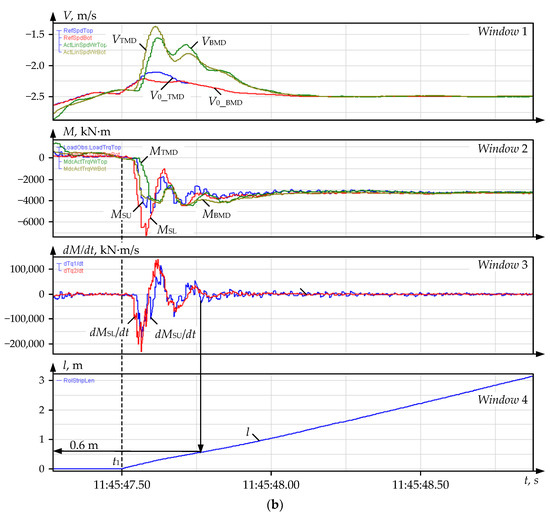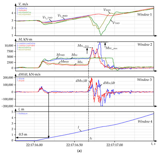 Along with the development of an observer that meets these requirements, the paper considers implementing it to analyze the emergency modes occurring at mill 5000. To do this, the principle of using the virtual processing of signals stored as data arrays during accidents is implemented. At the mill 5000, diagnostic data is constantly read by the PDA (process data acquisition) system [67]; all modern rolling mills use such devices. This allowed studying the transient torque processes in the following emergencies: spindle head and roll breakages, emergency shutdown of drives during rolling, etc. Note that the literature sources provide no information on such comprehensive studies.