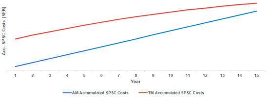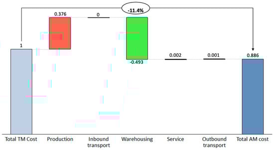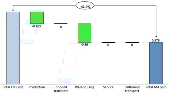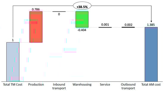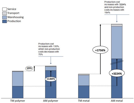 AM is a manufacturing method that has received increasing attention, as the field of application has increased in line with the progression of the technology []. AM produces products based on 3D computer aided-design (CAD) model and the production process is handled by a computer program [,]. AM offers several benefits compared to traditional manufacturing (TM) such as shorter lead time and availability on-demand, and thus increased potential for higher customer satisfaction, flexibility, and shorter downtime [,]. Per part production cost of high-volume parts with AM could be several times more expensive than producing via TM if the design is not changed or optimized for AM []. However, when comparing the costs of TM and AM, many companies neglect the total cost of TM, consisting of manufacturing and supply chain costs []. AM offers new ways to distribute products and lowering the holding cost of locked capital []. Due to the complexity of the cost structure when comparing AM and TM, there is a need to fully and comprehensively understand and calculate the production and supply chain cost components of AM-produced spare parts.