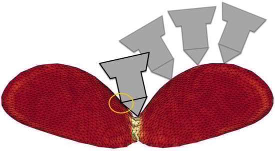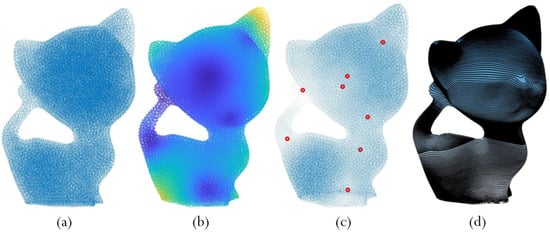 in which and stand for the shape parameter of the MQ kernel and Euclidean distance between a given RBF centre and each node of the function domain (i.e., ), respectively. Even though has a slight influence over the interpolated RBF field values (i.e., changing will result in a negligible difference in the RBF field values) [], we observe that it is considerably less impactful than the design parameters listed in Section 3.2. Therefore, keeping fixed (in our case ), we compute the RBF weights by interpolating the functions defined at RBF centres. The interpolated RBF weight field can be viewed as a point cloud (Figure 3b) that comprises a unique scalar value at every node of the function domain. Finally, to modify the original heat propagation pattern (i.e., modify the original geodesic distance field with the RBF weights), the weighted gradient vector field is derived as the product of the initial gradient vector field and the RBF weight scalar field, as follows:
