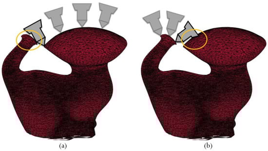 in which and represent the experimentally determined fine-tuning parameters for the input 3D model depending on the geometric complexity (Section 4.4). The motivation of this is that, with a careful tuning, eliminates most of the inward pointing nozzle orientation vectors (Figure 8b) in the proximity, thus preventing (if not eliminating) possible (global) collisions in high-genus 3D geometries (Section 4.4). Note that, while set by the user, the selected and must ensure that complies with the support-free overhang angle criterion, as defined in Equation (11).