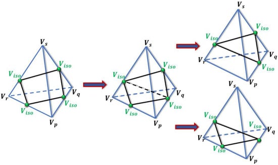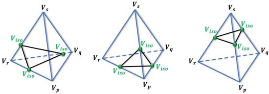 in which represent the end vertex coordinates of a candidate edge while stand for the field-values of and respectively. While there are many possibilities for occurrence of the three intersecting points (see Figure 4), the extremely rare case of having four intersecting points of an iso-surface in one tetrahedron is handled by splitting the quadrilateral into two triangles across the diagonal (see Figure 5). For example, in the first case (Figure 4a) of three intersecting points in Figure 4 (assume iso-value F is given), the coordinates of Viso can be computed by replacing Vi, Vj, Di, and Dj of Equation (5) with Vr, Vs, Dr, and Ds, respectively. The exact similar interpolation is performed along Vr, Vq and Vr, Vp edges. In the case of four intersecting points (Figure 5), the above interpolation is performed twice along the corresponding edges of both triangles. Once all these intersection points inside model are connected, the iso-surface layer that corresponds to iso-value F can be automatically extracted in the form of a triangular mesh. However, the mesh connectivity of the extracted surface layers would mostly remain irregular, leading to numerical degeneracies in the later tool path design phase. Therefore, we apply a remeshing technique proposed by Botsch et al. [] to ensure the required regular mesh connectivity within all the decomposed curved layers.