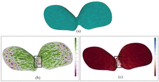 (a) A re-meshed decomposed curved layer; (b) the plot (the black square indicates high-risk concave features); and (c) the plot (the black square indicates high-risk concave features).