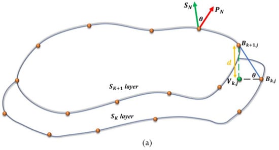 It is important to note that the geometric deviation occurs (or is measured) along the boundary of each decomposed layer [,]. Our volumetric error approximation model starts with finding the boundaries (i.e., the boundary vertices) of each curved surface layer. For this task, all the vertices that form non-repeated edges (i.e., boundary edges) are extracted as boundary vertices. We compute the volumetric error at each boundary vertex since the local layer thickness is adaptively changed in the optimisation phase. If the total number of boundary vertices in adjacent layers are given as , we consider as the total number of corresponding vertices. In our case, it is crucial to form the correspondence between the boundary vertices of two adjacent layers to approximate the triangular cross sections formed by the deviation between the two []. To find the corresponding vertex pairs between the boundary vertices of , we first calculate the Euclidean distance from each vertex of the current layer to all the boundary vertices of the adjacent layer. We label the closest vertex pairs as the corresponding vertices for any two adjacent curved surface layers. The next step is to form triangular cross sections for each corresponding vertex pair.