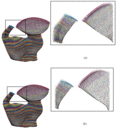 Nozzle orientation determination on the Kitten model: (a) the determined nozzle orientation vectors at the vertices; and (b) the final fine-tuned nozzle orientation vectors.