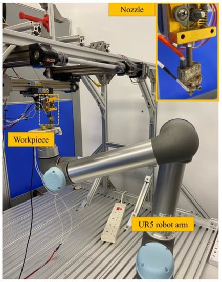 It is important to emphasize that the main purpose of our inexpensive homebuilt multi-axis printer is to assess the feasibility of the developed multi-step printing process, which suffers from a few hardware limitations that, though, could be improved. For example, the positioning error of the UR5 robot arm [], which causes a considerable impact on the printing surface quality, can be significantly reduced by employing a high-precision 5-axis CNC table []. In addition, a higher quality nozzle (e.g., 0.2 mm radius nozzle instead of the current 1mm radius nozzle) would be an ideal candidate to showcase the true potential of our surface-quality-improvement method.