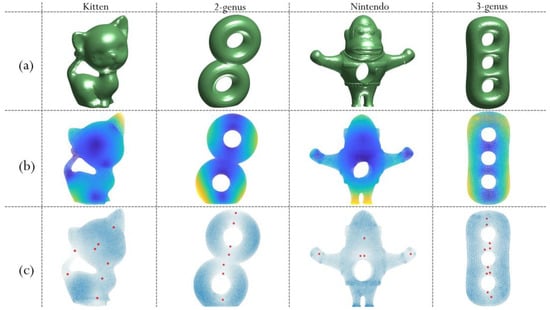 (a) Selected input 3D mesh models; (b) RBF scalar weight fields; (c) the optimised heat gradient vector field for each 3D model with the final determined RBF centres (red circles).