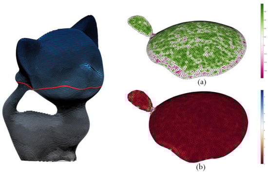 (a) values and (b) values plotted on a curved layer extracted from the geodesic distance field of the Kitten model.