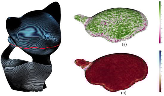 In this section, we provide the simulation results for the selected 3D geometries (Figure 10). The input 3D models are decomposed into the traditional planar layers, the conventional geodesic field-based curved layers, and the RBF-based (our method) curved layers. From the test data given in Table 1, it is evident that the curved layers generated from our RBF-based method exhibit much enhanced convexity (i.e., lower number of high-risk region vertices—VU) and contain the lowest approximated volumetric error (VE), while at the same time, achieving a higher compliance to the support-free requirement in contrast to geodesic field-based method.