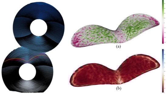 (a) values and (b) values plotted on a curved layer extracted from the geodesic distance field of the two-genus model.