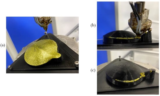 The above simulation results indicate that the curved layers decomposed from the geodesic distance field are susceptible to a greater risk for local gouging in all our tested 3D models. To better exhibit the local gouging problem in the geodesic field-based curved layers and the advantages of our convexity-enhanced curved layers, we have fabricated the layers shown in Figure 11, Figure 12, Figure 13 and Figure 14 from both the geodesic distance field and our optimised RBF-based field. Figure 15 shows the fabrication comparison for the Kitten model. The geodesic field-based layer of the Kitten model from Figure 11 is confirmed to incur local-gouging (Figure 15b,c) and therefore, the fabrication could be considered as a failure (as the nozzle must bypass the location to avoid damage to the nozzle). Figure 15a displays the fabrication result of the convexity-enhanced layer (Figure 12) from our method, which incurs no local-gouging. Similarly, for the two-genus model, Figure 16b,c reveal the failed fabrication of the curved layer (Figure 13) by the geodesic distance field, while Figure 16a shows the success by our method on the curved layer (Figure 14).