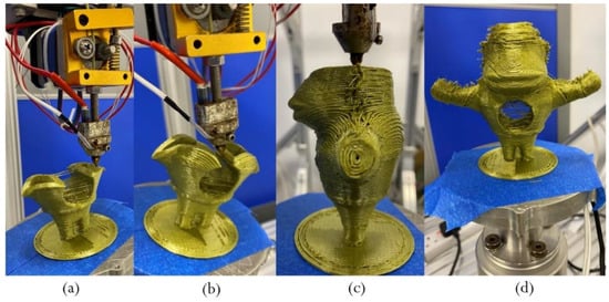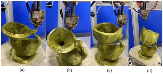 For the Kitten model, Figure 17a,b illustrate how local gouging is effectively avoided on convexity-improved curved layers during the fabrication process, while Figure 17c displays the effect of varying nozzle orientation parameters towards fabricating highly convex (potential risk of local gouging with a fixed nozzle orientation) layers, and Figure 17d displays the successfully fabricated Kitten model.