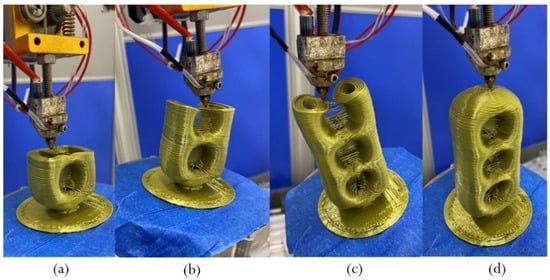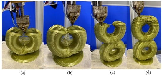 In terms of dealing with high-genus topology structures, Figure 18a and Figure 20c indicate the significance of and (the nozzle orientation tuning parameters) in realising safe fabrication of curved layers of 2-genus and 3-genus models. Fabricating such layers would be impossible with a vertex normal vector-based nozzle orientation. Figure 18b depicts how the convexity-improved layers of our method eliminate local gouging to realise successful fabrication of the slanted two-genus model (see Figure 18d). With the similar convexity-enhancement (e.g., Figure 20a) and adaptive thickness control through our fully automatic process planning, the three-genus model (see Figure 20d) is successfully fabricated in a support-free manner while maintaining a desirable finish surface quality (i.e., reducing the stair-case effect by adjusting the nozzle orientation when printing the part boundary). It is worthwhile to note that Xie’s method [] relied on manual processing to overcome the complexity of approximating a three-genus model with curved layers.