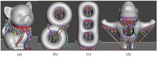Support-structures generated (at 45 overhang angle) by the Autodesk Meshmixer for (a) Kitten, (b) two-genus, (c) three-genus and (d) Nintendo in a 3-axis (i.e., planar slicing) setting.