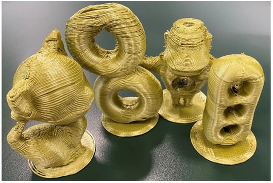 Finally, we show the physically fabricated models by our RBF-based multi-axis printing process planning system. The nozzle orientation tuning parameters ( and ) and the total fabrication time (in hours) for each model are tabulated in Table 3, while Figure 17, Figure 18, Figure 19 and Figure 20, respectively, show the photos of the four fabricated models, i.e., the Kitten, two-genus, Nintendo, and three-genus. Figure 21 depicts the support-structures required to print the overhang areas of the selected models in a 3-axis setting (i.e., with planar slicing).