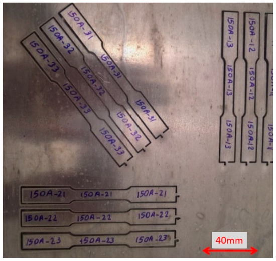The tensile specimens are prepared by water-jet cutting based on the ASTM-E8 standard. The samples are cut parallel, 45°, and perpendicular to the rolling direction for each aging condition, as shown in Figure 2. Each test is conducted three times to validate the repeatability of the test result. The uniaxial tensile tests are performed at room temperature with the STM 20 Santam universal testing machine under ISO 7500 and a crosshead speed of 0.03 mm/s. Therefore, the initial strain rates are 0.003/s.