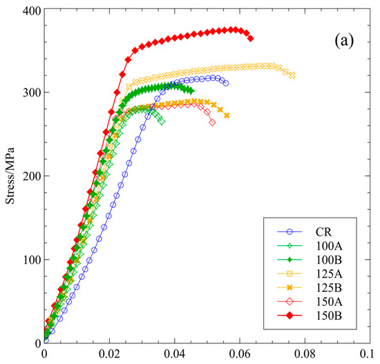 At test temperatures, static recovery of dislocations in heat-treated samples can reduce the strength. At the same time, some strengthening precipitates can form and increase the strength. Consequently, the difference in strength between CR and 100A should not be too much. The reason for lower strength in 125B and 150A can be attributed to the difference in hardening phases, but this would require further investigations of the microstructure, which are extremely difficult in highly deformed materials conditions, and therefore not performed here.