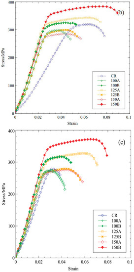Stress-strain curve of samples (a) parallel to, (b) 45° to, and (c) perpendicular to the rolling direction.