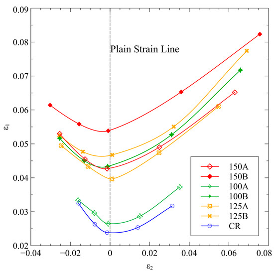 For illustration, strain-hardening exponent n, (from ) at plastic deformation is shown in Table 3. The strain-hardening is calculated according to ISO 10275 and is consistent with Yuan et al.’s [8,9] results. High strain-hardening results in less strain localization and uniform thickness distribution.