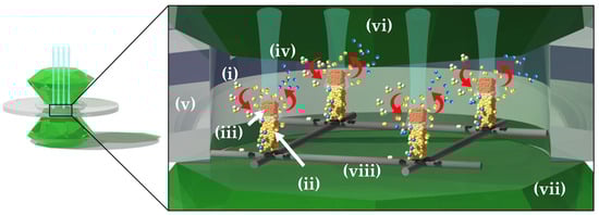 LRS-DAC systems can be implemented as single-sided configurations in which the incident beam is directed through one diamond anvil [18,75,77], such as illustrated in Figure 1, or as dual-sided configurations with two incident beams arriving on either side of the DAC [232]. Although the laser beam focal spot can encompass the entire clear aperture of the L-DAC, it is often much smaller to accommodate localised reactions. It is even possible to have multiple laser spots within the chamber, as depicted in Figure 1. The laser beam wavelength is selected to interact with the precursor (i), the pressure medium (vi), the substrate (such as the grid (viii) displayed in Figure 1), or the product (ii), depending on the type of reactions planned.