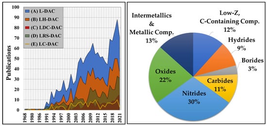 As shown in Figure 2A, the number of published L-DAC studies has grown steadily for the last three decades, whilst LRS-DAC-related studies have increased by a factor of 6+ times—second only to LH-DAC-related work, this trend appears to be continuing and exponential. Most LRS-DAC research can be categorised according to several material classes, as plotted in Figure 2B. This includes low-Z carbon-containing compounds, and metal -hydrides, -borides, -carbides, -nitrides, and -oxides, as well as high-Z metallic compounds and intermetallics. The majority of articles have been focused on the binary metal nitrides (30%) or the binary metal oxides (22%).