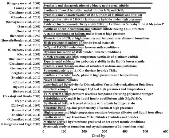 The most cited of these articles focused on the synthesis of binary metal nitrides, rare-earth hydrides, and diamond. The 28 most cited articles published to date are listed in Figure 3, together with their authors and topics; each of these had a minimum of 100 citations.