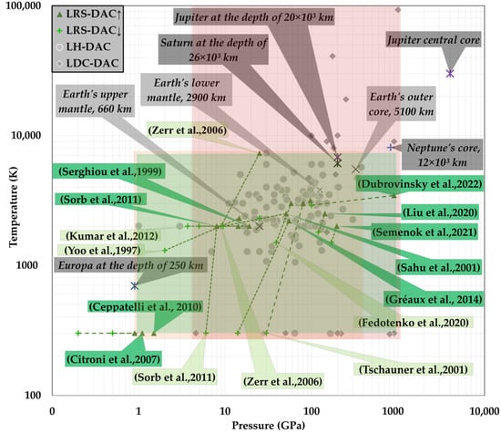 (A—Green) Peak P-T Map of LRS-DAC experiments [14,19,56,61,74,76,77,78,79,80,84,96,97,98,99,100,101,102,103,104], as contrasted with other L-DAC methods, such as: (B—Orange) LH-DAC experiments [28,29,73,105,106,107,108,109,110,111,112,113,114,115,116,117,118,119,120,121,122,123,124,125,126,127,128,129,130,131,132,133,134,135,136,137,138,139,140,141,142,143,144,145,146,147,148,149,150,151,152,153,154,155,156,157,158,159,160,161,162,163,164,165,166,167,168,169,170,171,172,173,174,175,176,177,178,179,180,181,182,183,184,185,186,187,188,189,190,191,192,193,194,195,196,197,198,199,200,201,202,203,204,205,206,207,208,209,210,211,212,213,214,215,216,217,218,219,220] and (C—Red) LDC-DAC experiments [46,221,222,223,224,225,226,227]. For reference, several P-T conditions are provided, including: 250 km down in Europa’s oceans [228]; 660, 2900, and 5100 km below the Earth’s surface [136,190,221]; 12 × 103 km deep within Neptune’s core [229]; 26 × 103 km deep inside Saturn’s liquid- hydrogen mantle [230]; and 20 × 103 km deep in Jupiter’s upper atmosphere [231].