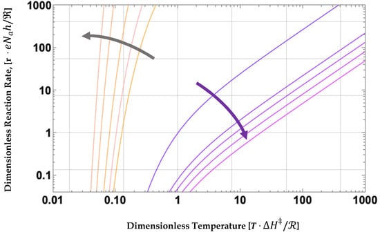 Log-Log parametric plot of reaction rates from Equation (17) vs. dimensionless temperature, T. The yellow-grey family of curves is for positive , while the purple to red family of curves is for negative, . Pressure is increasing in the directions shown by the arrows.