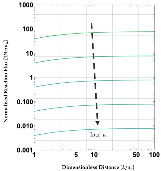 Finally, observe that in Figure 7, the smaller the reaction zone radii, ao, the more rapid the diffusive reaction flux, r’, to both spherical sinks (direction of dotted arrow indicates increasing ao). Note that r’ scales as 1/ao. This enhanced reaction-flux effect has been observed previously in other microchemical processes [281], e.g., hyperbaric-pressure laser chemical vapour deposition (HP-LCVD), in which rapid growth of fibres along the direction of the beam axis is made possible by minimising the size of the reaction zone [282].