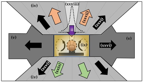 As described in Part I for continuous wave (cw) LH-DAC experiments [26], the temperature rise at the reaction zone is dependent on the balance between the incident laser power and the rate of heat transfer to the surrounding precursor medium and DAC components. As illustrated in Figure 8, energy is delivered by the focused laser beam (purple arrow, [ii]), and heat conducts away through the diamond anvils and chamber gasket (black arrows, [xxvi]). Where temperatures are sufficiently high, thermal radiation from the reaction zone can be significant (orange arrows, [xxvii]). This radiation can be used to monitor the reaction temperature (see [x] in Figure 5). The same is true for the LRS-DAC configuration, but in this case, the laser-heated (reaction) zones are often intentionally smaller than those for LH-DAC experiments (where broad constant temperature profiles are desired). For LRS-DAC experiments, the reaction zone is often surrounded by a comparatively large pressure-medium region. Light can also be observed from the backside of the DAC and measured using a spectrometer (green arrows, [xxix]).