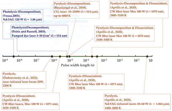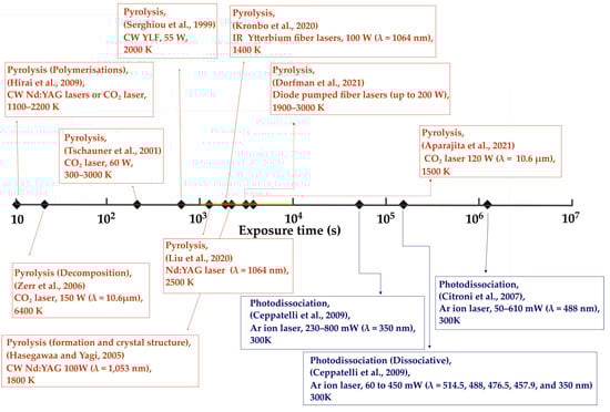 Classes of laser-induced reactions obtained (pyrolysis, photoexcitation, photolysis, etc.) vs. laser illumination time for continuous-wave lasers, including laser wavelengths, from the ultraviolet (350 nm) to the infrared (10.6m) [19,22,23,61,71,74,75,76,78,79,80,81].